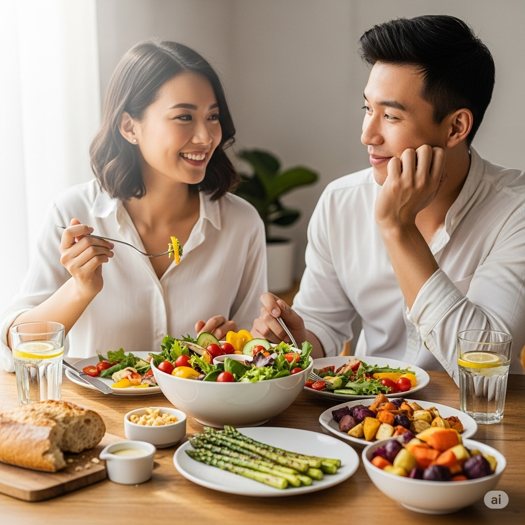 이미지생성: 현명한 식사 순서를 보여주는 그림식 안내도 (채소→단백질→탄수화물 순서로 식사하는 모습)